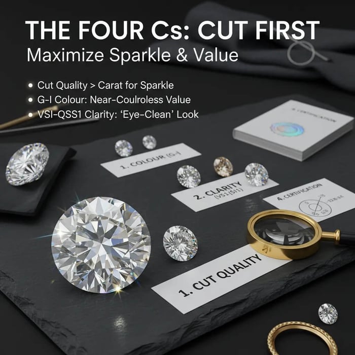 - Spend where it shows: prioritise cut quality for sparkle, then balance colour or clarity.